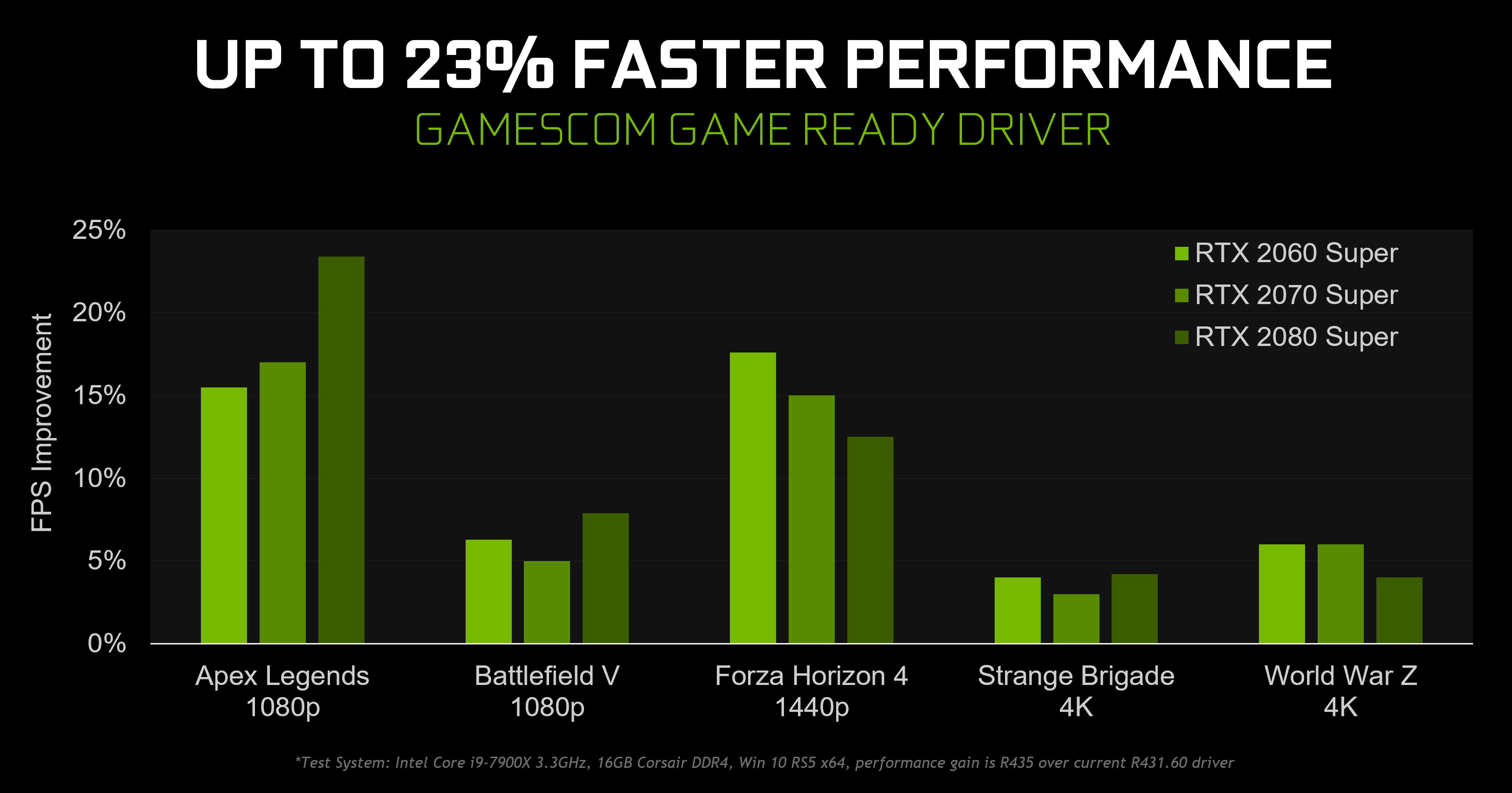 GeForce 436.02新驅(qū)動(dòng)下,《Apex英雄》、《戰(zhàn)地5》、《極限競(jìng)速:地平線4》、《奇異小隊(duì)》、《僵尸世界大戰(zhàn)》等游戲的性能,相比于此前的431.60版本,可提升最多達(dá)23.4%。