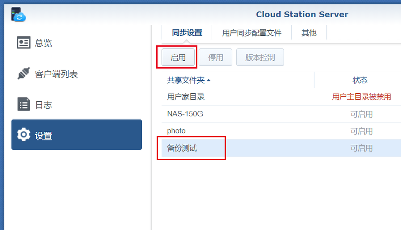 2、在Cloud Station Server中,設(shè)置,啟用新建的“備份測試”共享文件夾;