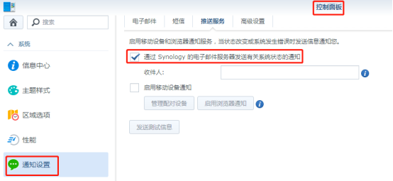 注意:服務(wù)供應(yīng)商有Gmail、Yahoo!、Outlook、QQ或者自定義SMTP服務(wù)器或者在信息中心注冊(cè)synology賬戶接收系統(tǒng)的告警信息。