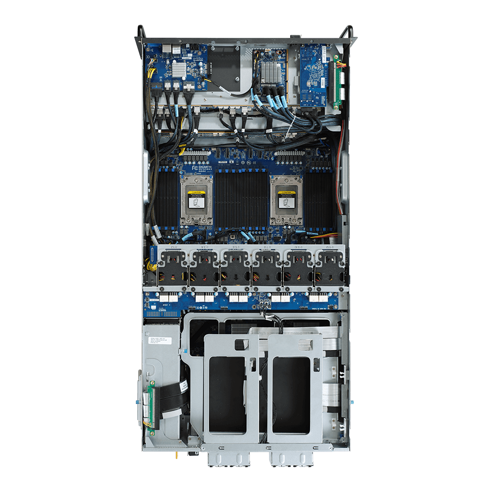 The G482-Z50 can support ten PCIe Gen 3.0 GPGPU cards in balanced mode, with each five GPU cards connected to one CPU downstream via a PCIe switch to minimize GPU to GPU communication latency.