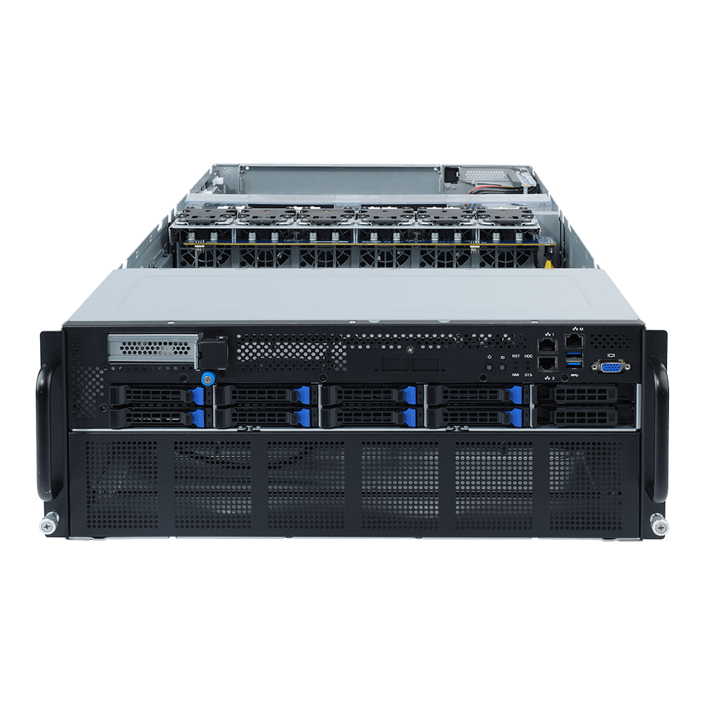 The G482-Z52 is one of the world’s first PCIe Gen 4.0 GPU server systems to be released to the market, featuring support for up to eight dual-width PCIe Gen 4.0 GPU cards (with each GPU connected directly to the processor via PCIe root). It is ideal to integrate an “AMD on AMD” solution using 2nd Gen EPYC processors together with the Radeon Instinct MI50, the world’s first 7nm, PCIe Gen 4.0 data center GPU, or with other Gen 3.0 or Gen 4.0 GPU cards for applications such as deep learning, cloud gaming or video streaming.