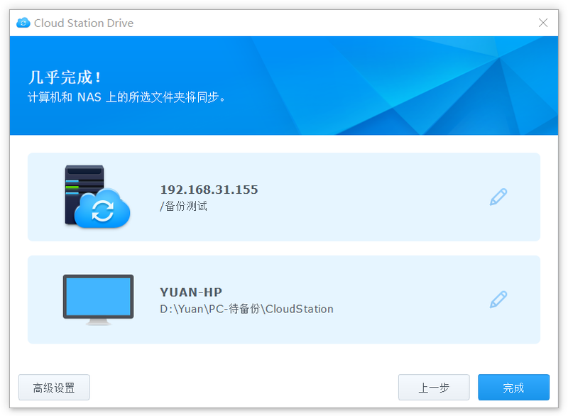 6、點擊右側(cè)的鉛筆,選擇NAS服務(wù)器上備份共享文件夾:備份測試;選擇本地電腦上備份文件夾:PC-待備份;